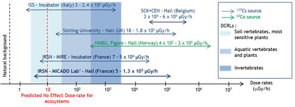 Four 137Cs sources are used to irradiate organisms at dose rates ranging from 5 µGy/h to 100 mGy/h