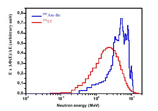 The 241Am-Be source is covered with a 1 mm thick lead shield to limit the emission of photon radiation, whereas the 252Cf source is used without a shield.