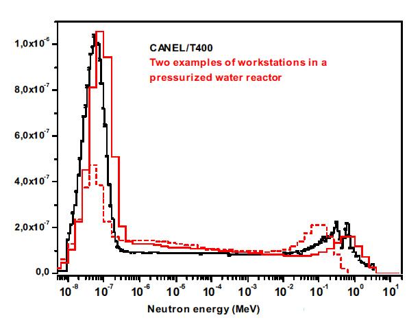 ​CANEL is used to create realistic neutron fields. These have two major advantages. The first is that they can be used to test instruments in an environment similar to real conditions (wide energy distribution, significant contamination with photons, variable neutron incidence angles, etc.), in full knowledge of the field’s characteristics. The second is that they can be used to calibrate radiation protection equipment in a neutron field that, at least in terms of energy distribution, is representative of the workplace where it will be used, as shown by the graph below, and they therefore enable a calibration coefficient to be defined that reflects the actual use of the instrument.