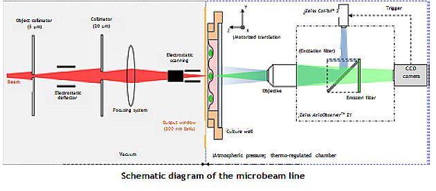 ​The beam leaves in the atmosphere through a 150 nm thick extraction window made from Si3N4 opposite which there is a motorized sample holder and an epifluorescence microscope. The various systems are managed by specially developed software that automates the calibration and irradiation phases. One special characteristic of this microbeam is that, because of its microscopy system, it can perform in-line video microscopy, which means that radiation-induced effects occurring in the samples can be seen directly only a few seconds after irradiation.